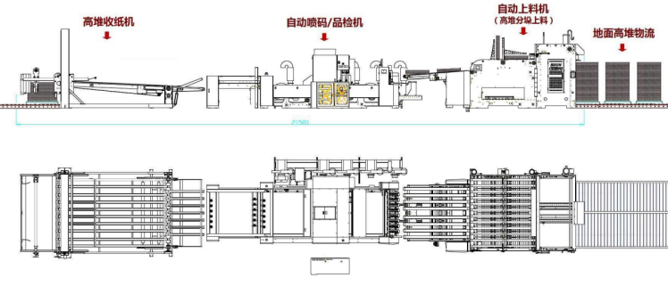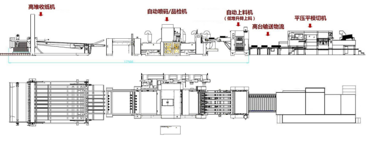 聯(lián)動(dòng)方式二:平壓平模切、自動(dòng)上料、噴碼/品檢、計(jì)數(shù)排出、打包、碼垛;適合模切前的大紙張或模切后需要在進(jìn)行粘箱、釘箱工藝的產(chǎn)品噴碼,節(jié)省人工降低勞動(dòng)強(qiáng)度;