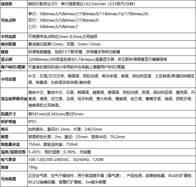 二、偉迪捷1210噴碼機(jī)機(jī)器參數(shù)