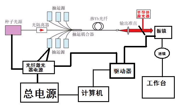 光纖激光打標機主要由激光電源、激光器、半導(dǎo)體激光指示器、光學(xué)掃描系統(tǒng)、微機、保護系統(tǒng)等部分組成。